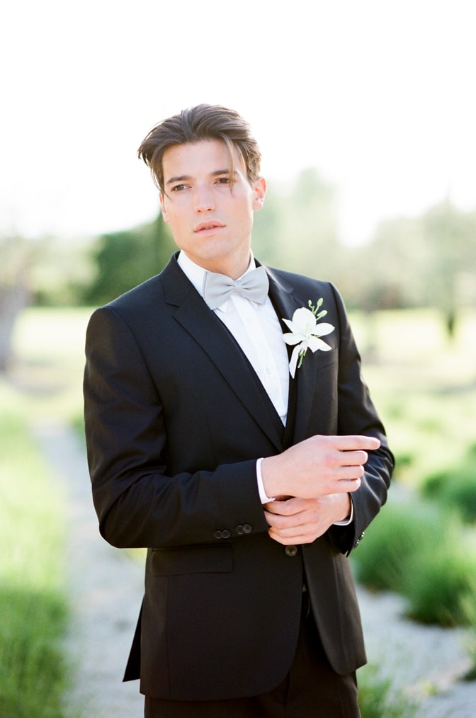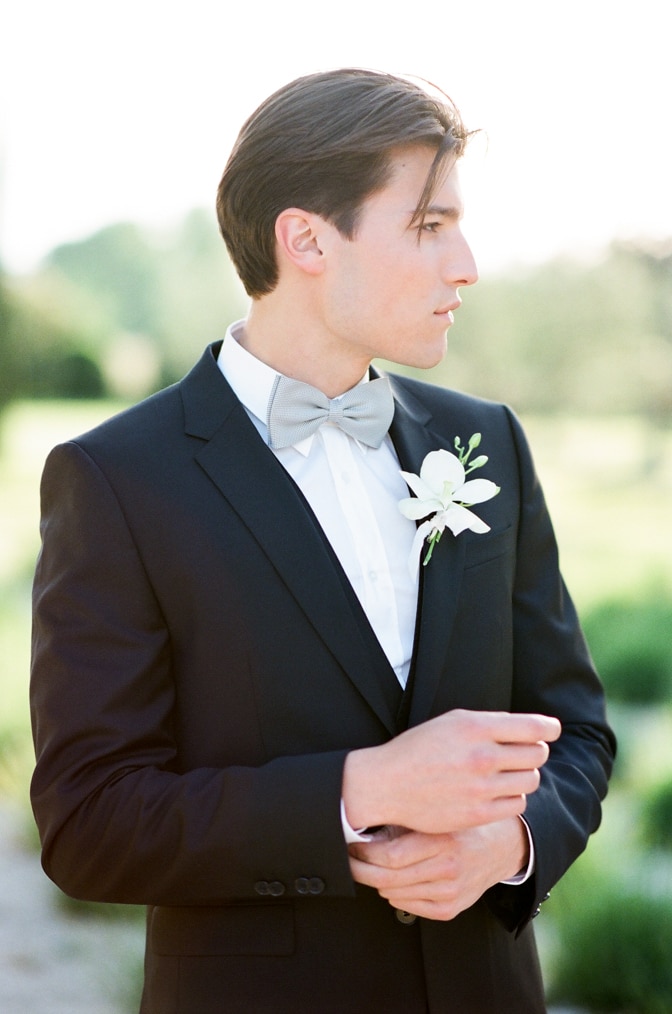 The all-important question: should the groom go for a bowtie or tie? The answer depends on your feel and the look of your wedding design. Are groom and bride going for a classic wedding theme or a more modern, laid-back theme? I’d definitely recommend a bowtie for a classic, black tux wedding, but when it comes to a modern wedding you could go either way. A tie would complete the modern groom’s style at a city hotel wedding, and at a more industrial-themed wedding, a bowtie with pattern would also be a fun element to add spontaneity. If you want to go completely modern, then you could also just go without a tie or bowtie! I’d recommend this look for a warm summer venue or a more casual, beach-themed wedding.