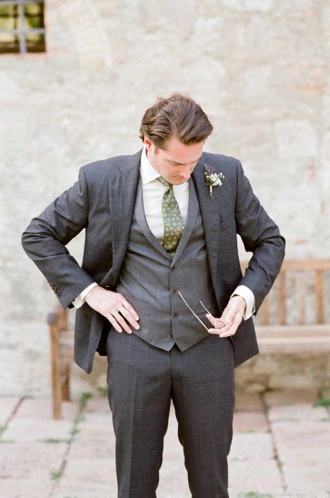 When it comes to accessories, the modern groom usually falls short on ideas. They think about shoes, socks, a bow tie or tie, and maybe some cufflinks and a boutonniere–that’s it. But have you ever thought of integrating a very unique heirloom piece, one kept for generations in your family, to enhance your modern groom attire? John, a very trendy groom, incorporated his grandfather’s pocket watch into his wedding-day styling for a touching effect. The watch was a perfect fit for his custom-made suit and helped give him his own charming look, which definitely not only complemented his bride but also stood out on its own. If you would like to see more of this modern groom look, head over to John & Michelle’s wedding here.