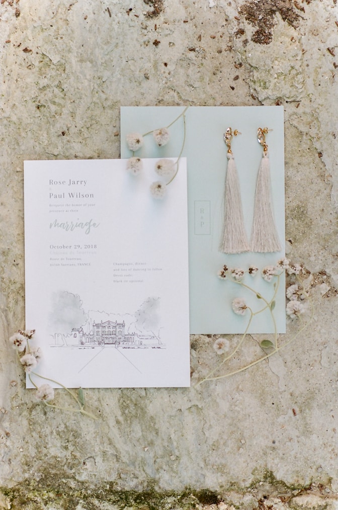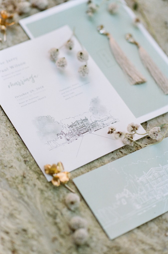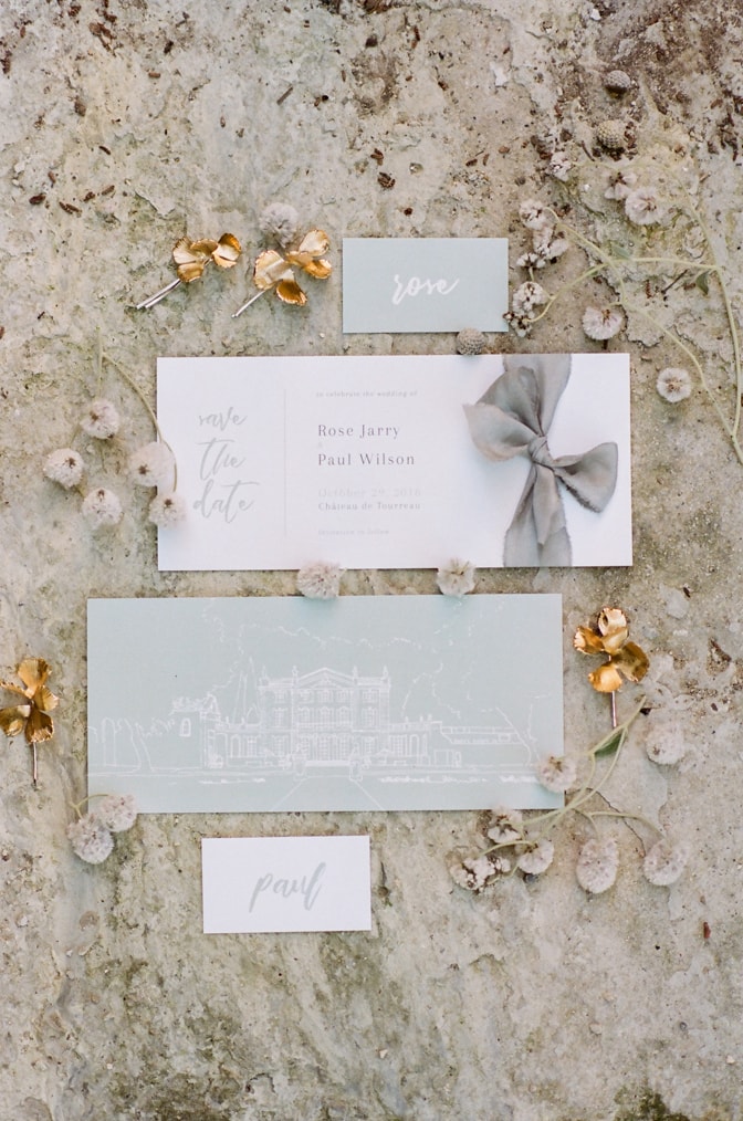 If you are looking for a simpler, but still modern luxury wedding invitation then you might want to go for a foil look. Because a stunning accent of gold foil makes an invitation feel just a little bit more special. Or you could enhance your modern luxury wedding invitation with a drawing of your wedding venue. That way your guests will know what to expect and can look forward to your wedding weekend celebration. Featured are modern luxury wedding invitations from “Creme de Papier” (white / turquoise invitation suite with castle drawing).