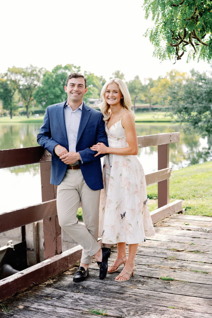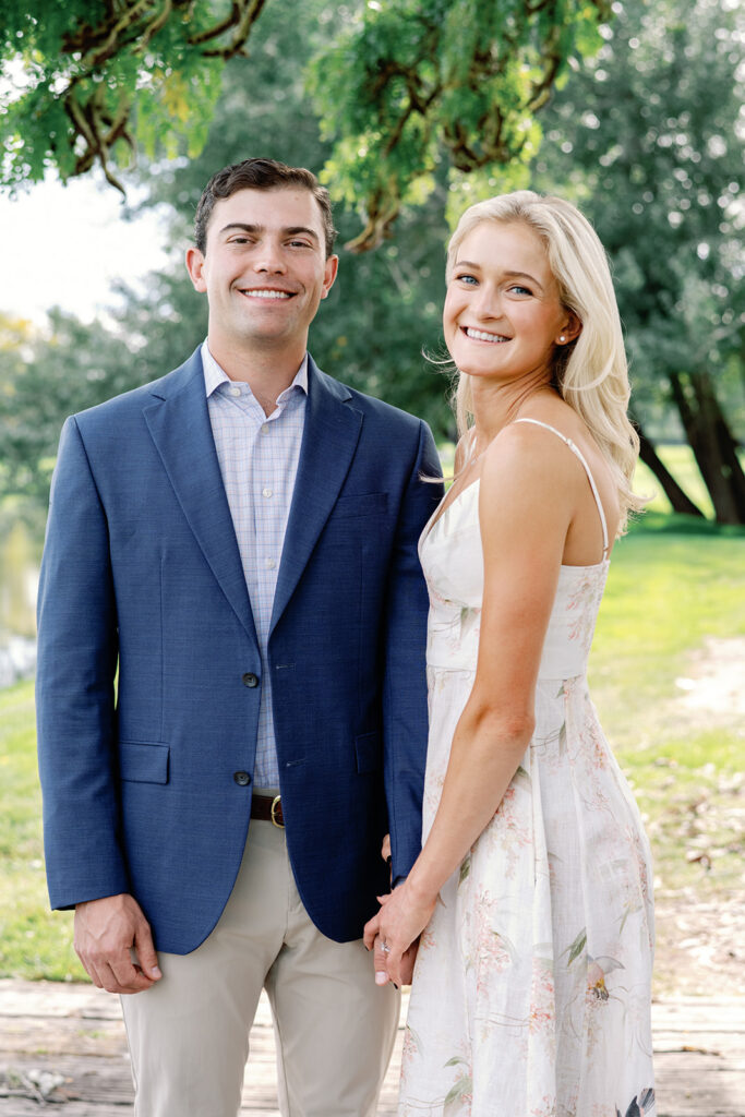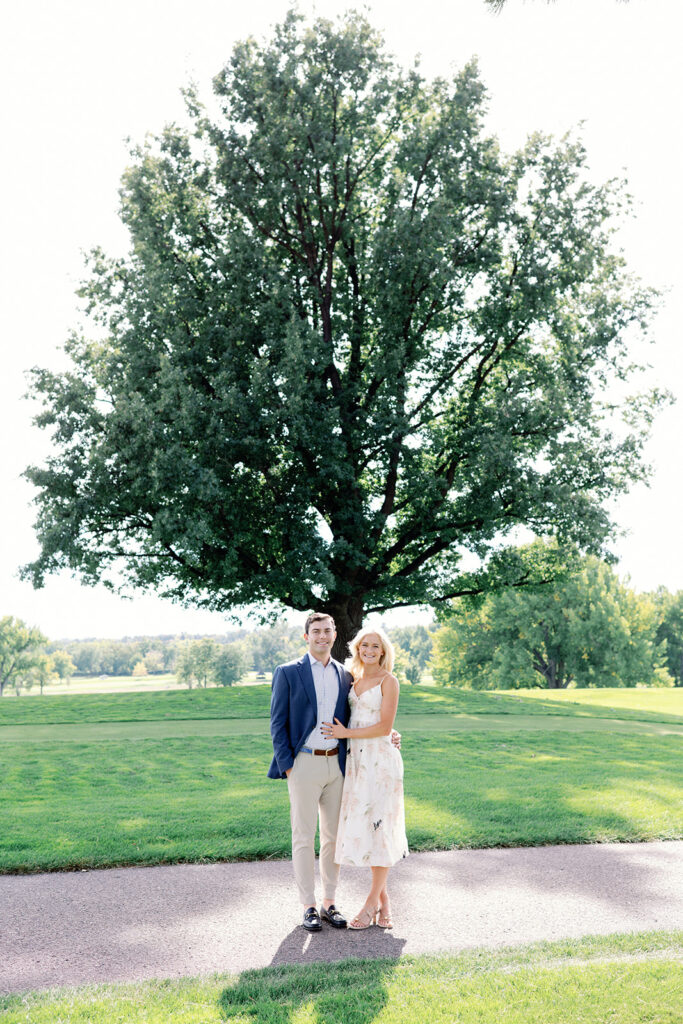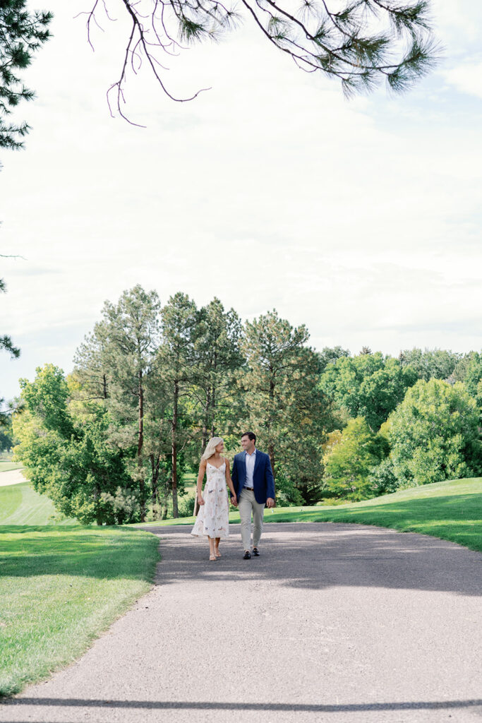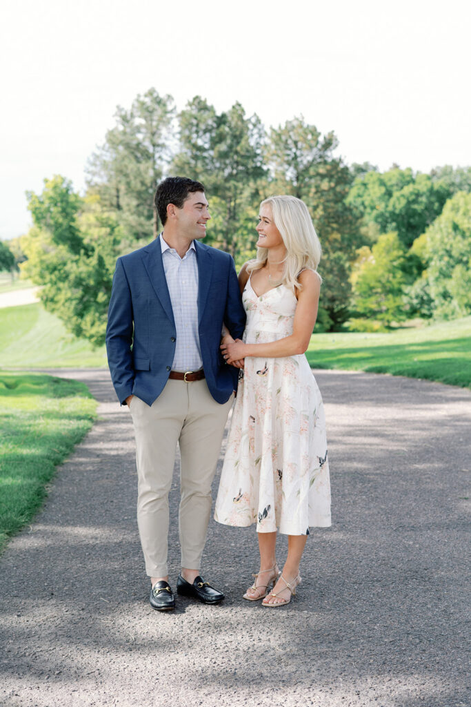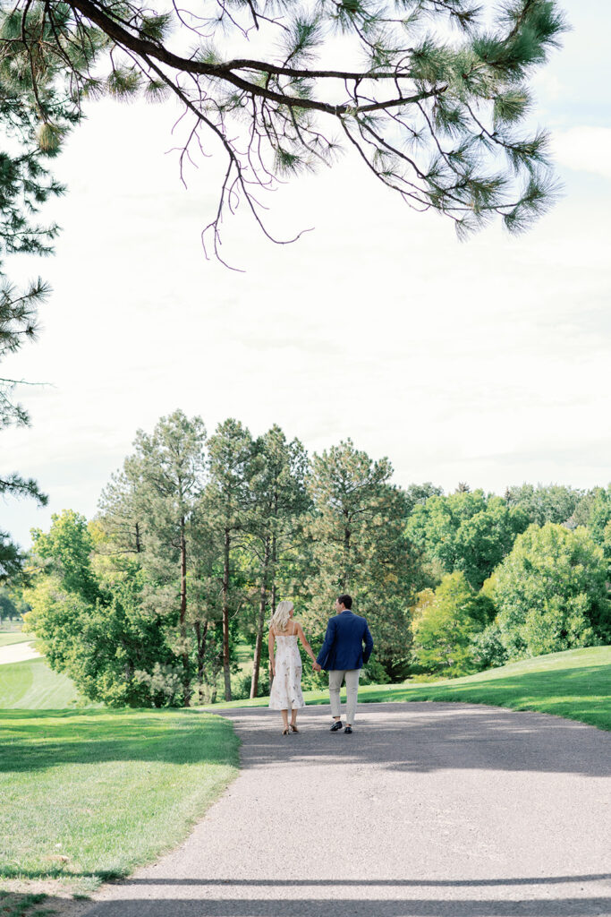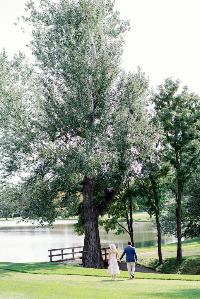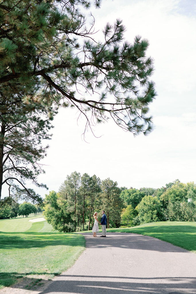 Taylor & Will enjoyed a quiet moment together at the Cherry Hills Country Club in Denver. Dressed smartly but relaxed, they shared an easy smile that reflected their happiness. The calm setting of the trees and lake made the occasion feel natural and genuine.