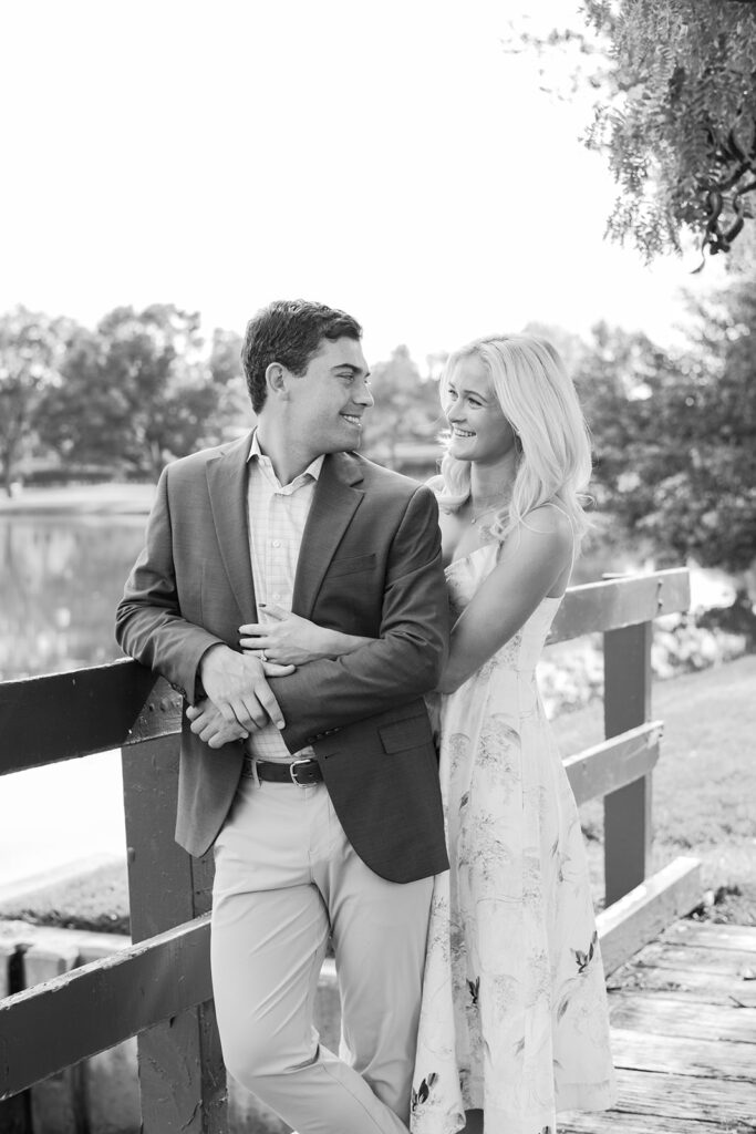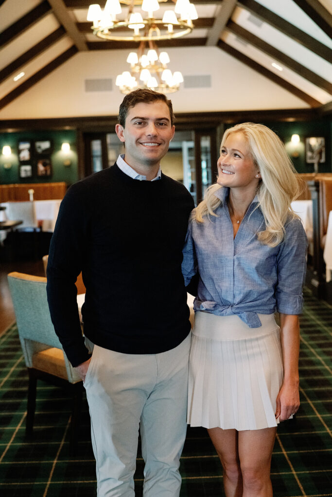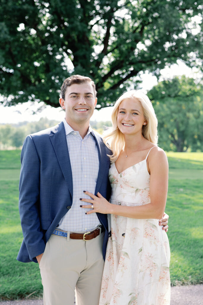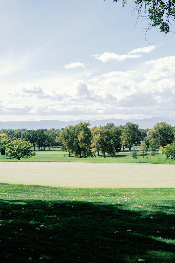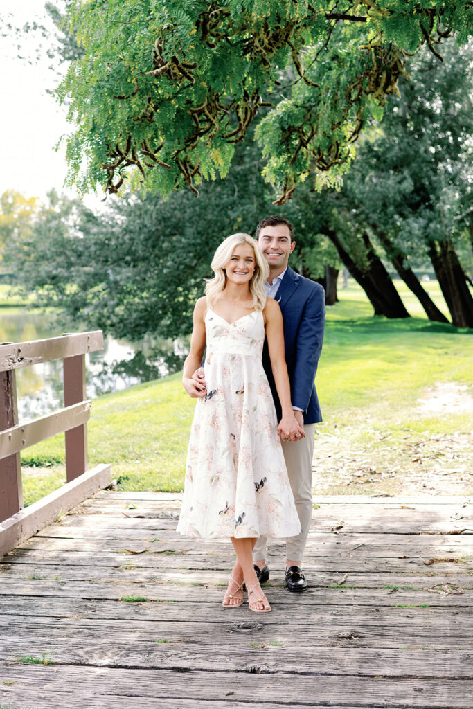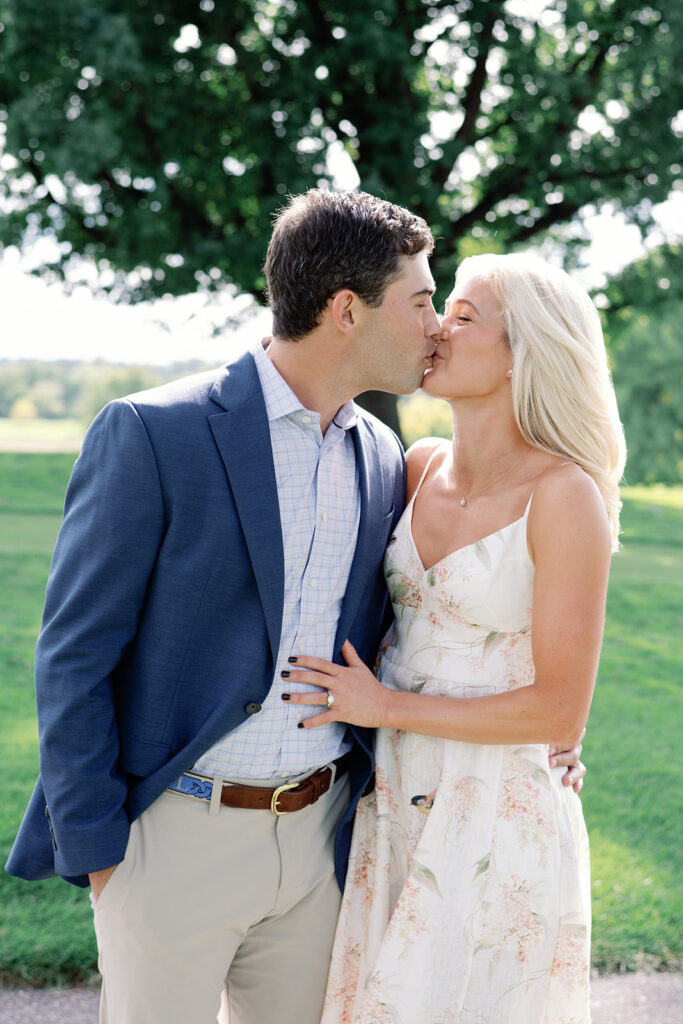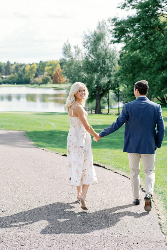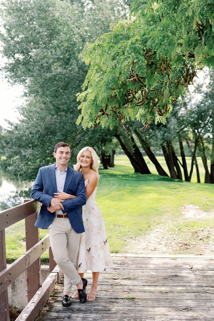 Taylor & Will enjoyed a quiet moment together at the Cherry Hills Country Club in Denver. Dressed smartly but relaxed, they shared an easy smile that reflected their happiness. The calm setting of the trees and lake made the occasion feel natural and genuine.