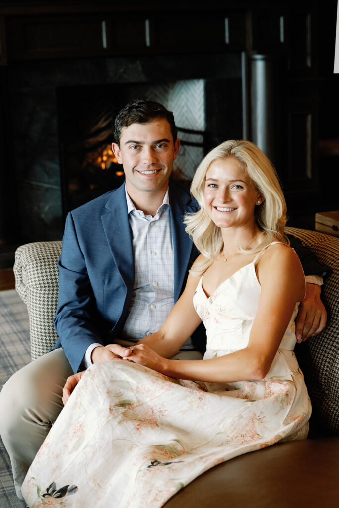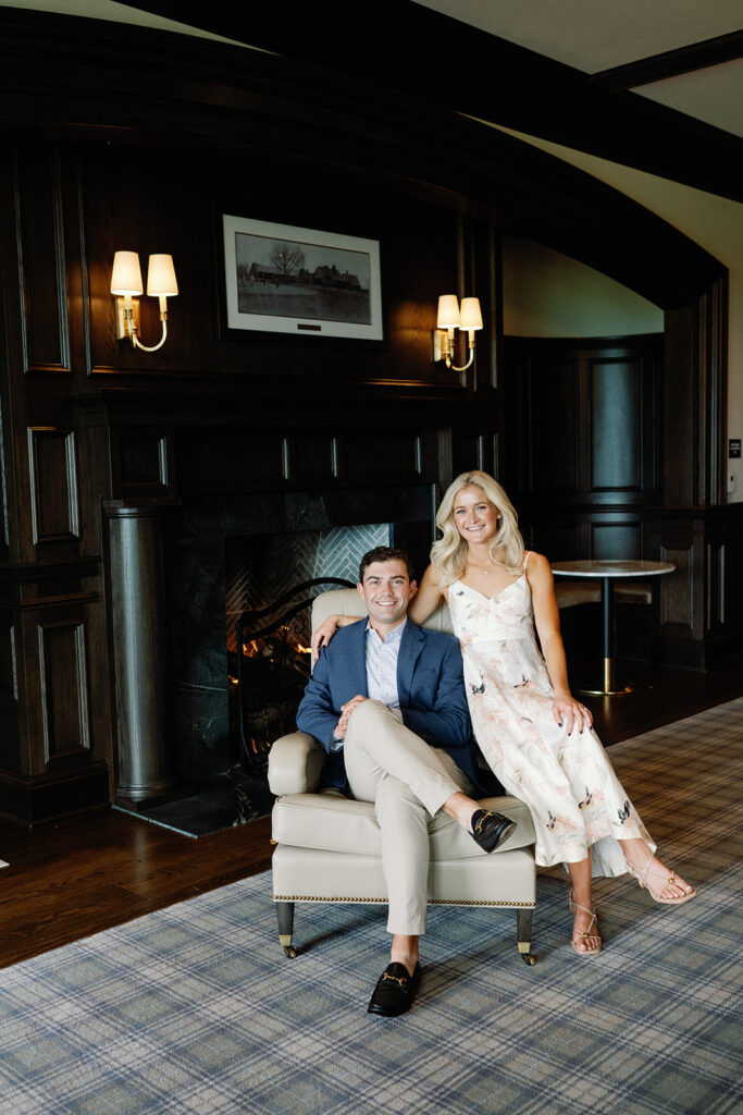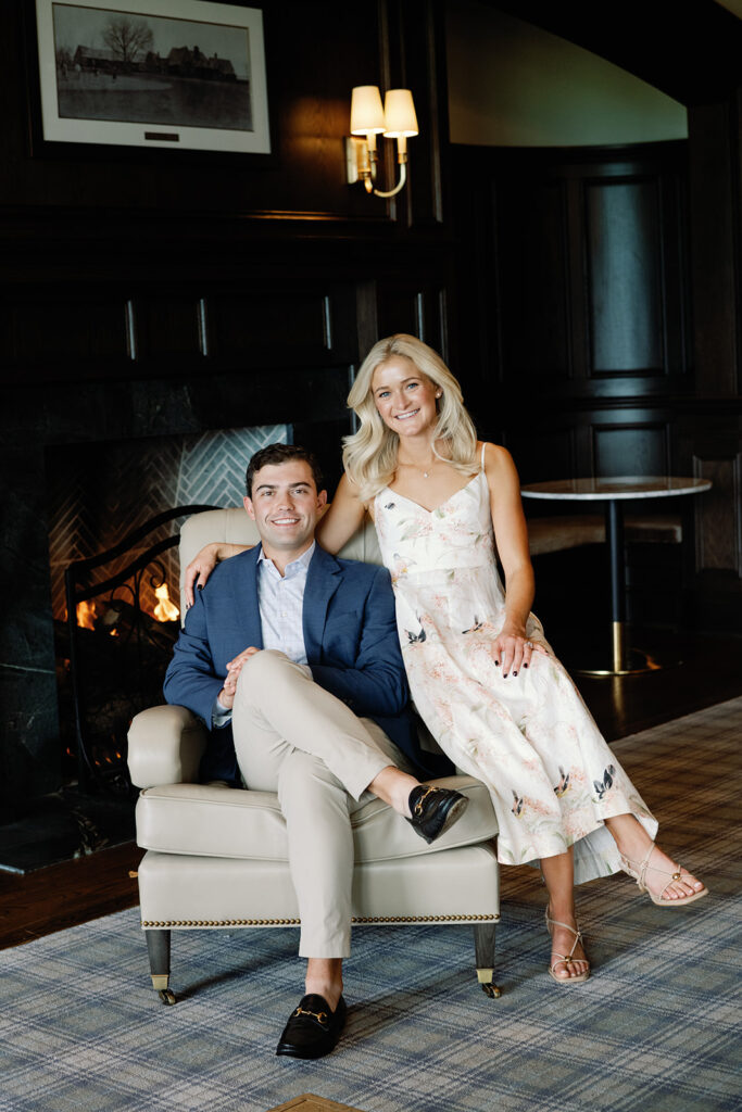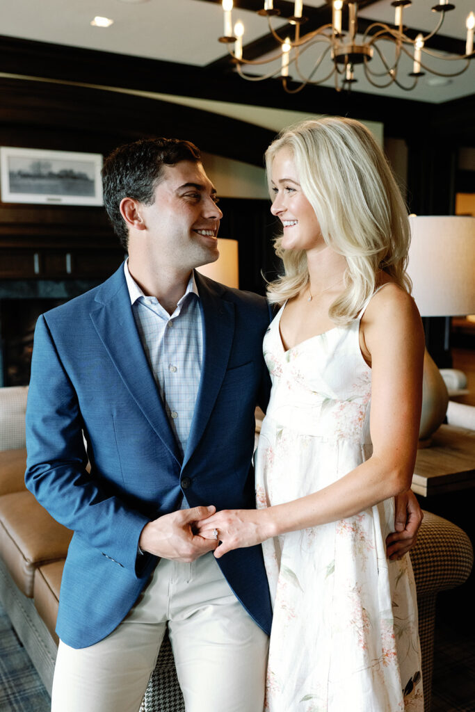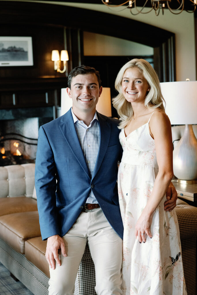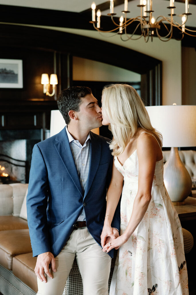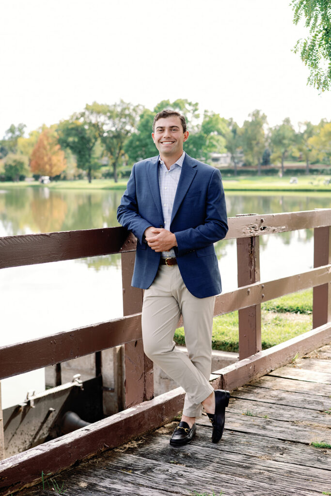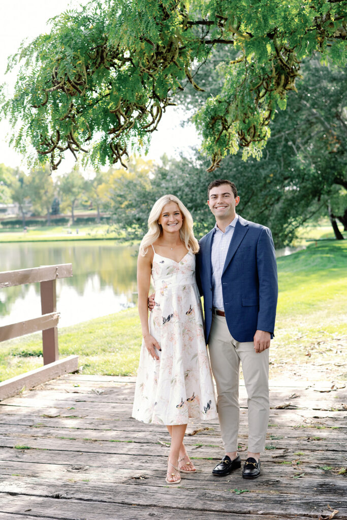 Taylor & Will enjoyed a quiet moment together at the Cherry Hills Country Club in Denver. Dressed smartly but relaxed, they shared an easy smile that reflected their happiness. The calm setting of the trees and lake made the occasion feel natural and genuine.